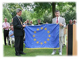 2001 mit der Europafahne für die seit zehn Jahren währenden Aktivitäten der Stadt Bad Kötzting innerhalb der Douzelage.
